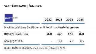 Dank steigender Verkaufspreise konnte der österreichische Markt für Sanitärkeramik im Jahr 2025 das Umsatzniveau halten, zeigen aktuelle Daten einer Marktstudie.