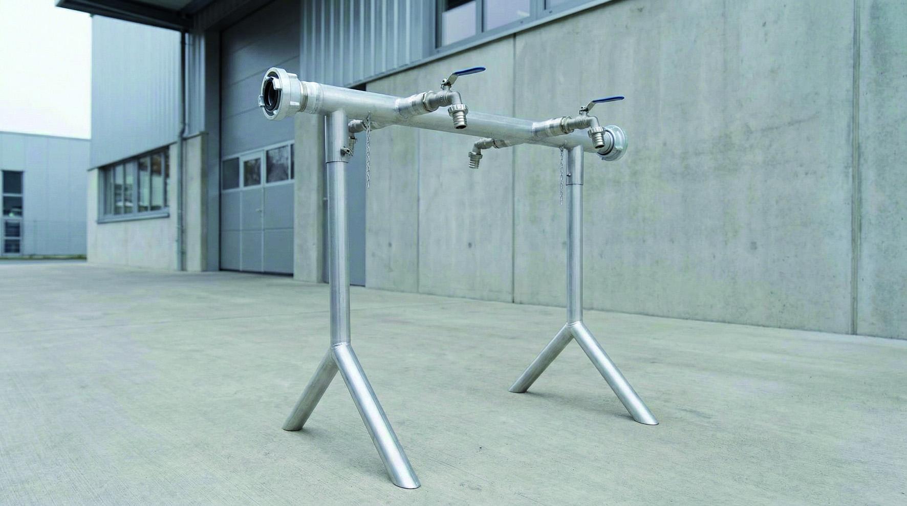 Zudem lassen sich die Stehfüße der Gruppenzapfstelle von Aschl einfach demontieren. Platzsparend gelagert steht sie damit Zivilschutz-Behörden und Feuerwehrleitstellen im Ernstfall schnell als mobile Leitung zur Verfügung.