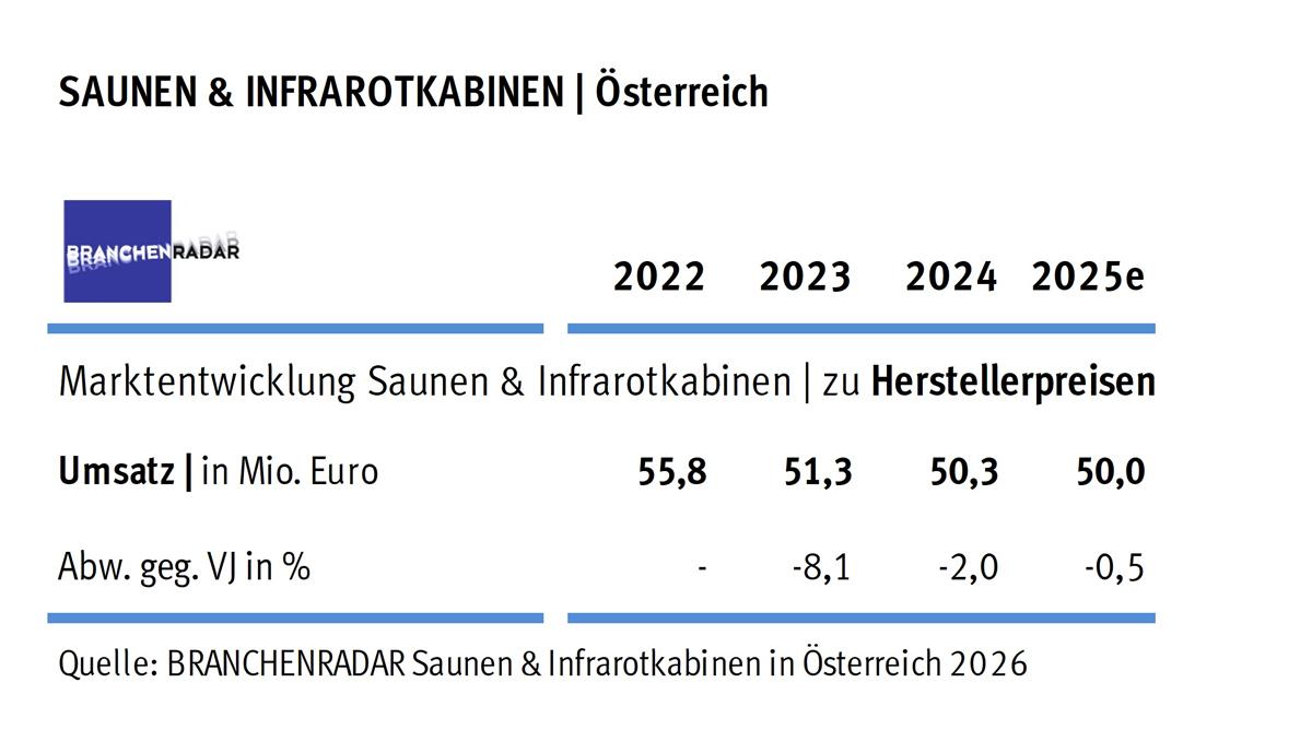 Private Wellness-Oasen werden wieder häufiger nachgefragt, zeigen aktuelle Daten einer Marktstudie des Marktforschungsinstituts BRANCHENRADAR.com Marktanalyse. Die Anbieter von Saunen und Infrarotkabinen hatten es in den letzten Jahren nicht leicht. Seit 2022 entwickelte sich das Geschäft durchwegs rückläufig. Nun dürfte die Talfahrt aber zu einem Ende kommen. Laut aktuellem BRANCHENRADAR Saunen und Infrarotkabinen in Österreich konsolidiert sich im Jahr 2025 der Umsatz von Herstellern bzw. Generalimporteuren mit voraussichtlich 50 Millionen Euro auf Vorjahresniveau.