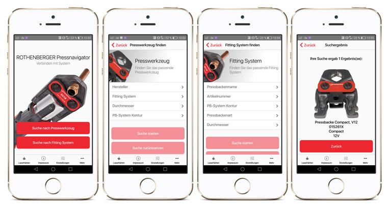 Derzeit bietet die Pressnavigator App Informationen zu rund 180 Fitting-Systemen und rund 330 Presswerkzeugen. ROTHENBERGER hat nur Fittingsysteme aufgenommen, die mit Presswerkzeugen im Unternehmen getestet worden sind. Die App wird regelmäßig ergänzt, sodass Nutzern über Updates jederzeit aktuelle Informationen zur Verfügung stehen. Die App gibt es für Android https://play.google.com/store/apps/details?id=com.pressnavigator&hl=de und iOS https://itunes.apple.com/tr/app/pressnavigator/id1210099164?mt=8.