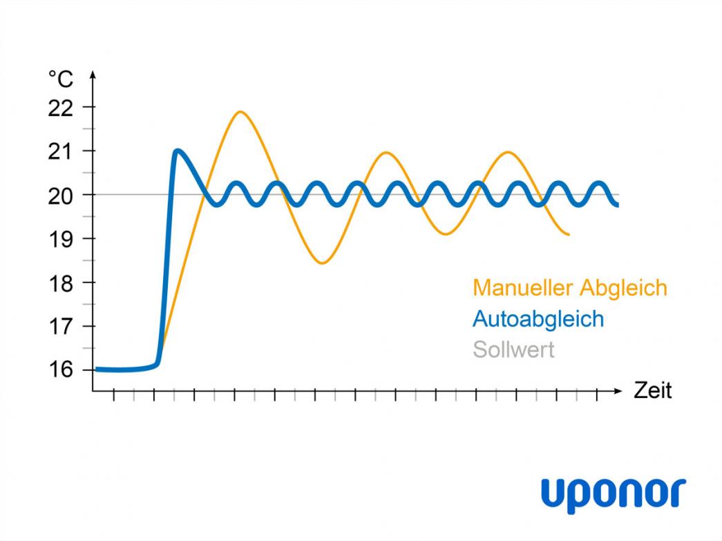 Der integrierte Autoabgleich passt die benötigte Wassermenge des Systems oder des Raumes an, ohne dass komplizierte Neuberechnungen oder Anpassungen erforderlich sind.